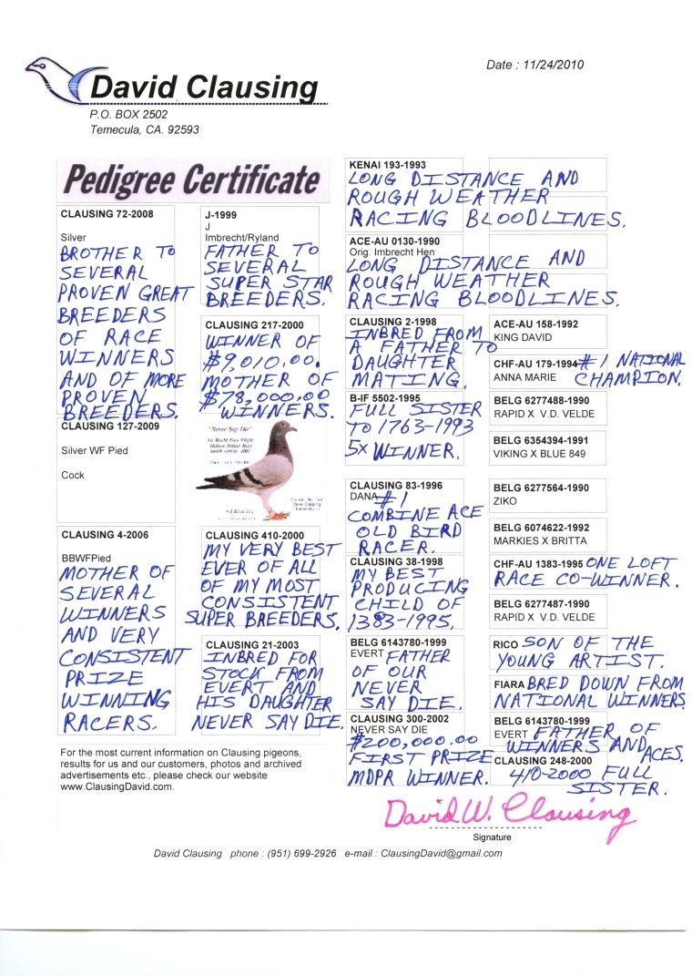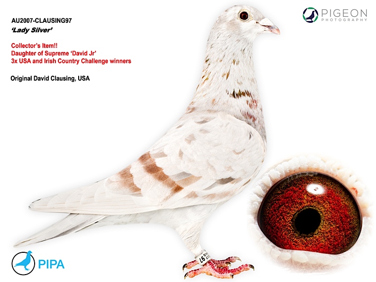 'Lady Silver’ was bred by David Clausing. Very few of her children have ever been entered for races but her true value is that she is a breeder of pigeons that reproduce winners and performers – i.e. her g.children.