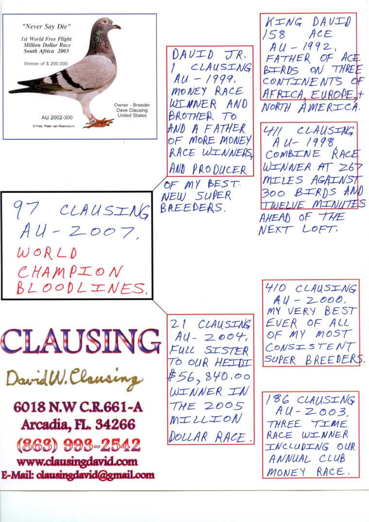 Father is AU 2008 Clausing 72, fabulous breeding cock from family of supreme winners