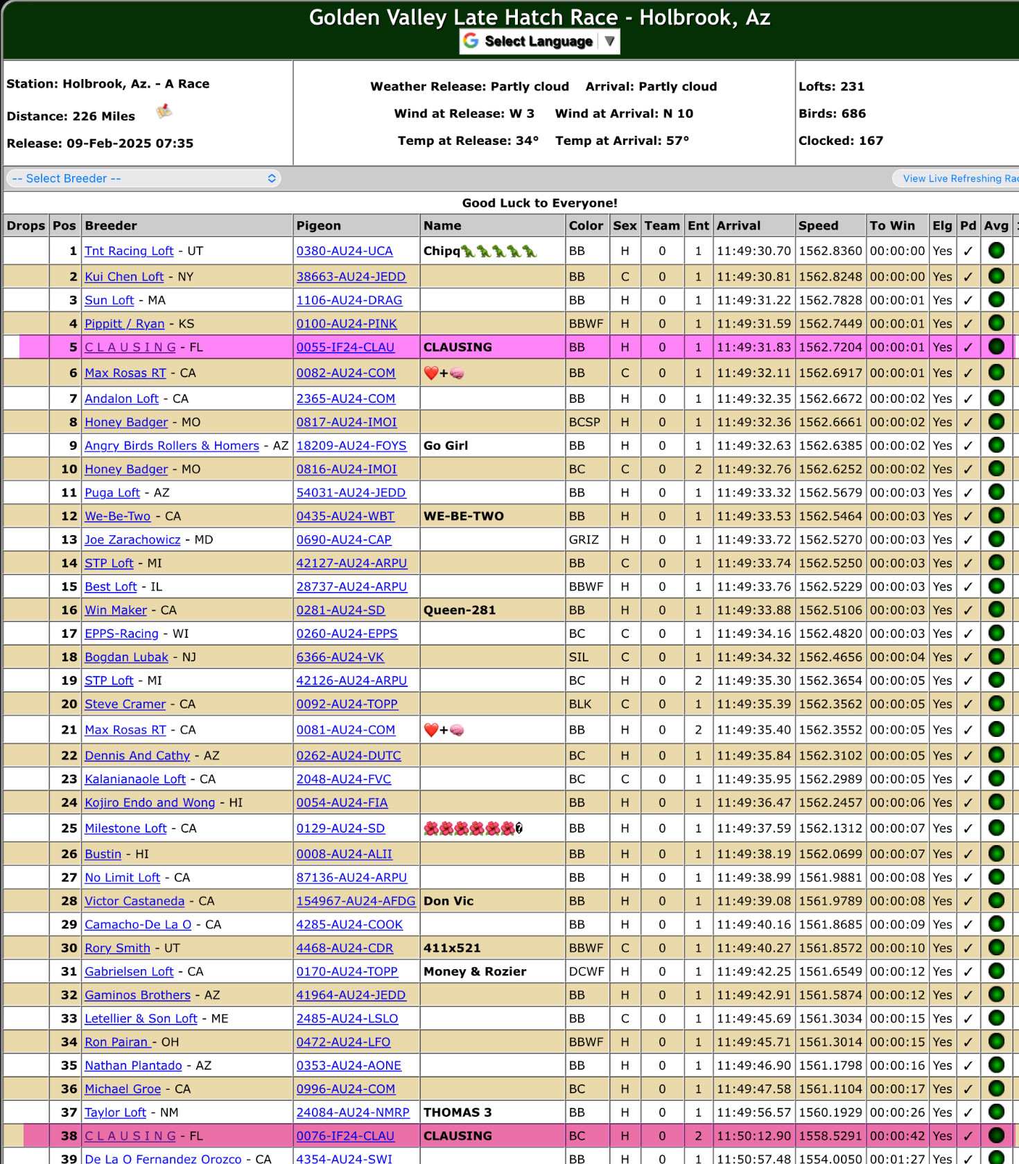 Clausing Racing Pigeons: Results are in the Breeding