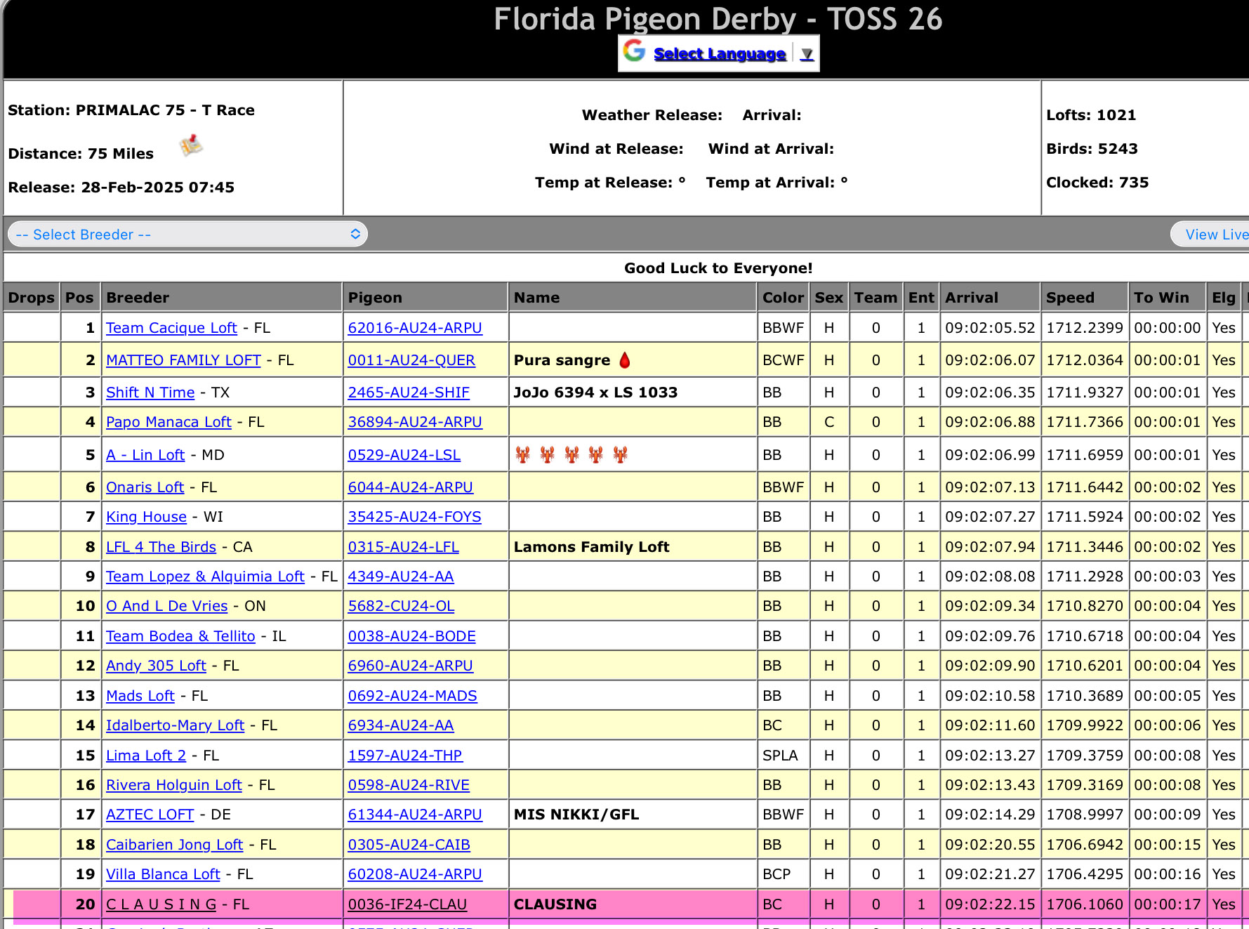| 02/23/2025 | Florida Pigeon Derby | 022025_fpd |